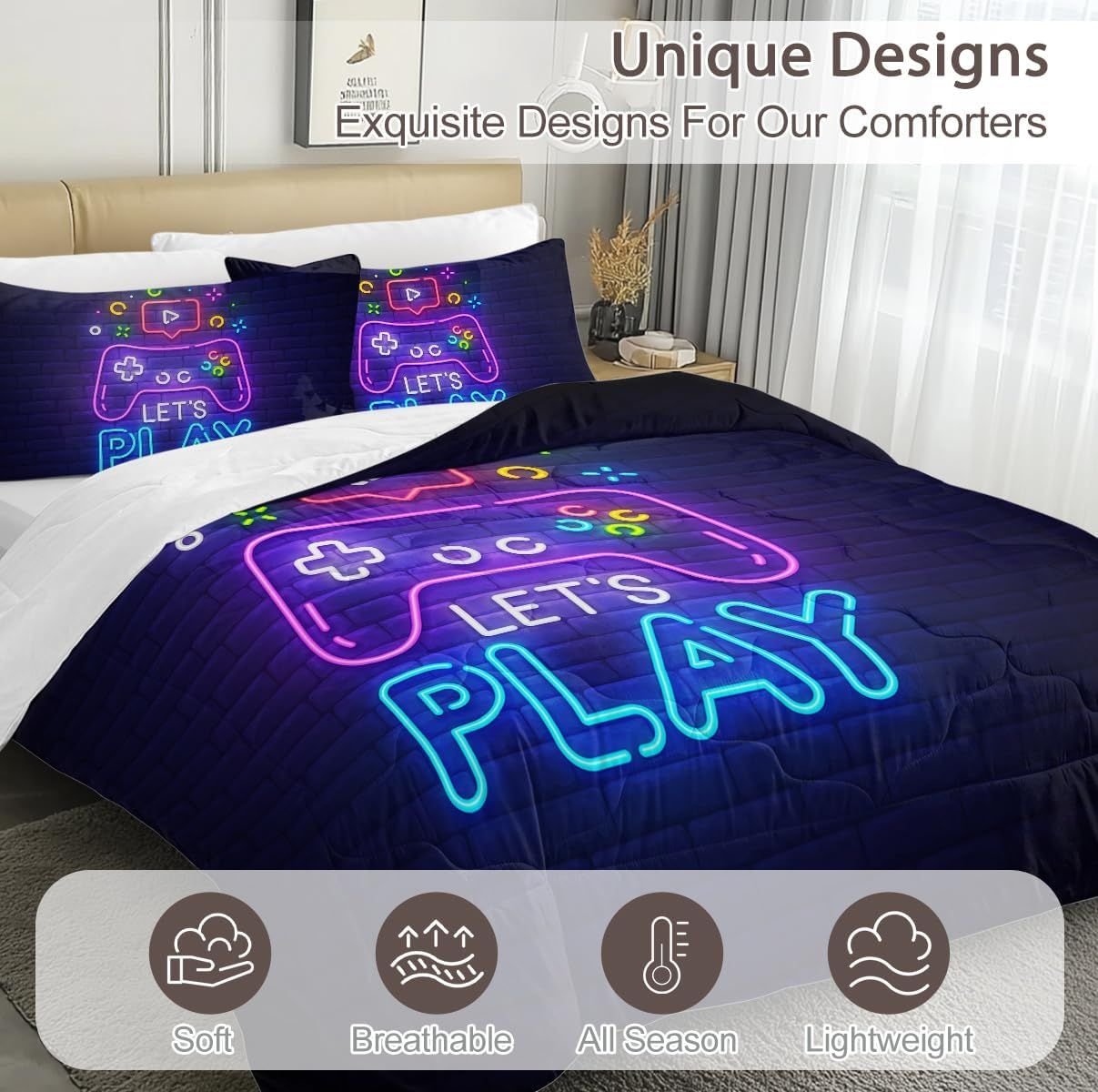 Home > Gaming Comforter Set for Boys Trippy Gamer Bed Set with Comforter and Pillow Shams Neon Purple Blue 3 Piece Game Contoller Bedding Set for Kids Teens