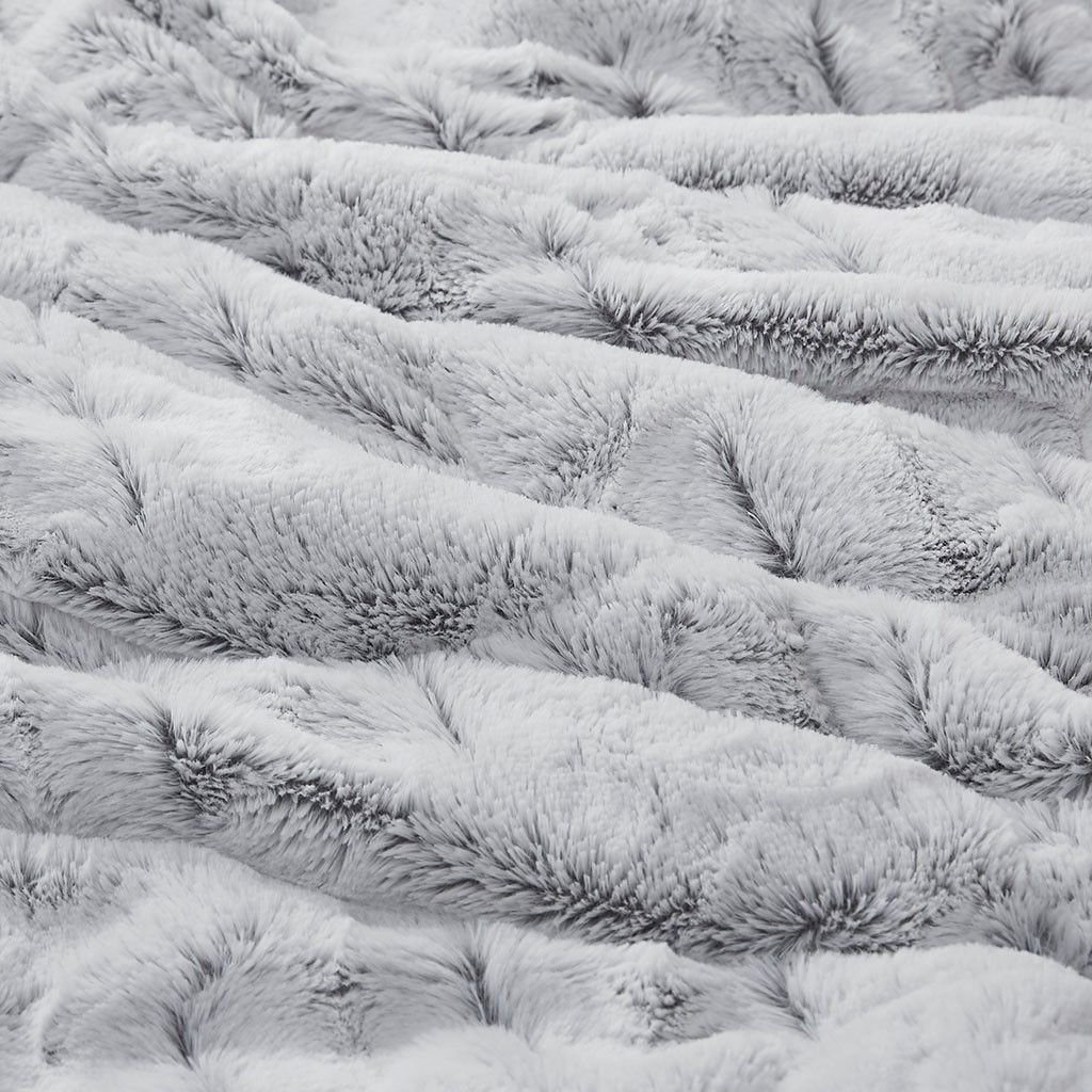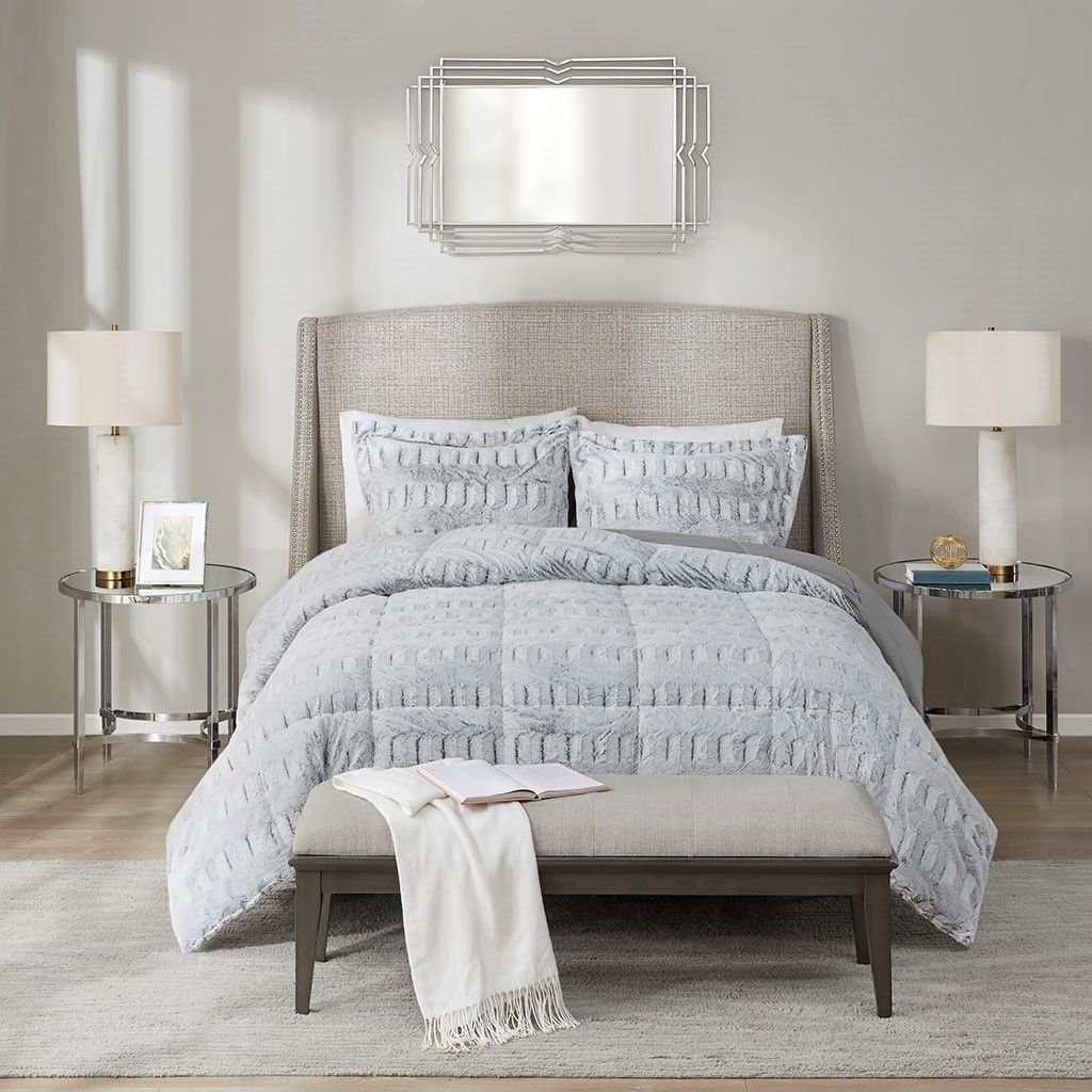 Sleep in the pure softness and comfort of the Gia Back Print Long Fur Comforter Mini Set. The ultra-soft grey comforter flaunts a stylish brushed faux fur on the face that flips to a soft faux mink reverse, for a luxurious look and feel. Matching shams (1 sham for Twin sizes) mirror the design of the comforter and feature a 2-inch flange to complete the comforter set. Hypoallergenic filling in the faux fur comforter provides exceptional warmth and comfort, while the end-to-end box stitching keeps the filling in place. Incredibly soft, this reversible long fur comforter mini set brings the perfect amount of comfort and glamorous style to your bedroom decor. This comforter is OEKO-TEX certified, meaning it does not contain any harmful substances or chemicals to ensure quality comfort and wellness.